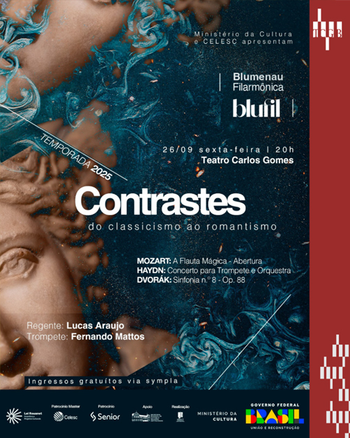 No dia 26 de setembro, às 20h, o palco do Teatro Carlos Gomes será tomado pela força e pela sutileza da música sinfônica no concerto “Contrastes”, da Blumenau Filarmônica. Sob a regência de Lucas Araújo e com a participação especial do trompetista Fernando Mattos como solista, a apresentação convida o público a mergulhar nas nuances entre o classicismo e o romantismo, estilos que marcaram a história da música ocidental.