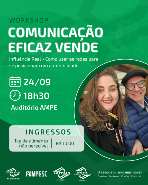 A AMPE Blumenau, por meio do Núcleo do Artesão e com apoio do Núcleo Mulher Empreendedora e parceria com o Oktoberblog, realiza no dia 24 de setembro o workshop “Comunicação eficaz vende! Influência Real – Como usar as redes para se posicionar com autenticidade”. O encontro acontece no Auditório da AMPE, com início às 18h30 […]