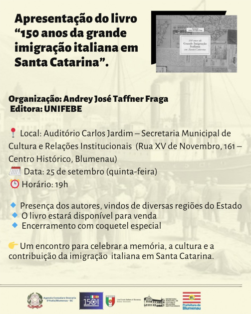 Na próxima quinta-feira, dia 25 de setembro, às 19h, Blumenau será palco de um momento histórico com o lançamento do livro que celebra os 150 anos da imigração italiana em Santa Catarina. A apresentação acontece no Auditório Carlos Jardim, na Secretaria Municipal de Cultura e Relações Institucionais (SMC), e marca a chegada da obra à cidade que abrigou alguns dos núcleos pioneiros da imigração, como Rodeio e Rio dos Cedros, fundados em 1875.