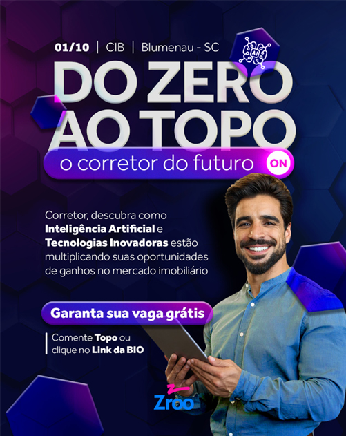 O futuro do mercado imobiliário será o foco do evento “Do Zero ao Topo | O Corretor do Futuro”, que acontecerá no dia 01 de outubro de 2025 (terça-feira), a partir das 18h30, no Auditório do CIB – Centro de Inovação de Blumenau.
