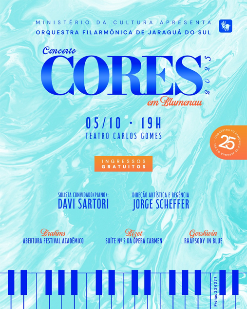 Realizado pela Sociedade Cultural Artística, o concerto “Cores” é um evento de classificação livre e uma excelente oportunidade para toda a comunidade blumenauense vivenciar um espetáculo de alta qualidade musical.