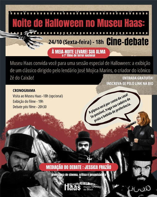 Em uma sessão especial de Halloween, o Museu Haas, o primeiro museu funerário do Brasil, convida o público para mergulhar no universo do terror nacional com a exibição do clássico “À Meia-Noite Levarei Sua Alma”. O filme é a obra-prima de José Mojica Marins, criador do icônico personagem Zé do Caixão. O evento, que tem entrada gratuita, acontecerá nesta sexta-feira, 24 de outubro, no Museu Haas.
