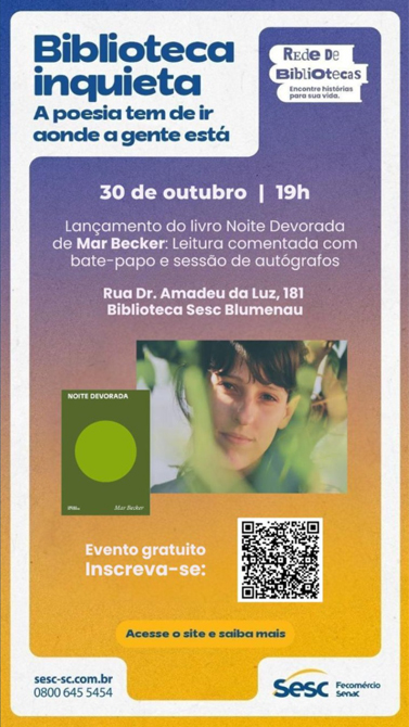 Para celebrar a Semana Nacional do Livro e da Biblioteca, o Sesc Santa Catarina realiza o projeto “Biblioteca Inquieta”. A edição de Blumenau receberá a poeta Mar Becker para uma noite de leitura comentada, bate-papo e sessão de autógrafos. O evento, que é totalmente gratuito e tem classificação livre, acontecerá no dia 30 de outubro, às 19h, na Biblioteca do Sesc Blumenau.