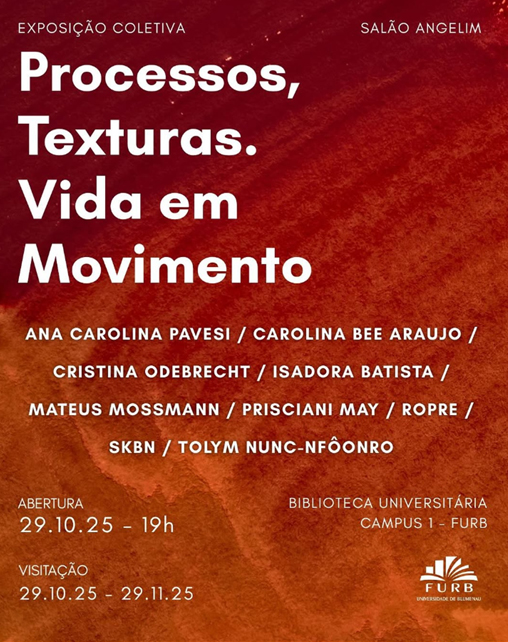 A Divisão de Cultura da FURB promove a abertura da exposição coletiva “Processos, Texturas. Vida em Movimento”, que integrará a Temporada de Exposições Salão Angelim 2025. A mostra será inaugurada no dia 29 de outubro, a partir das 19h, no Salão Angelim, localizado na Biblioteca Universitária do Campus 1 da FURB. A entrada é gratuita. […]