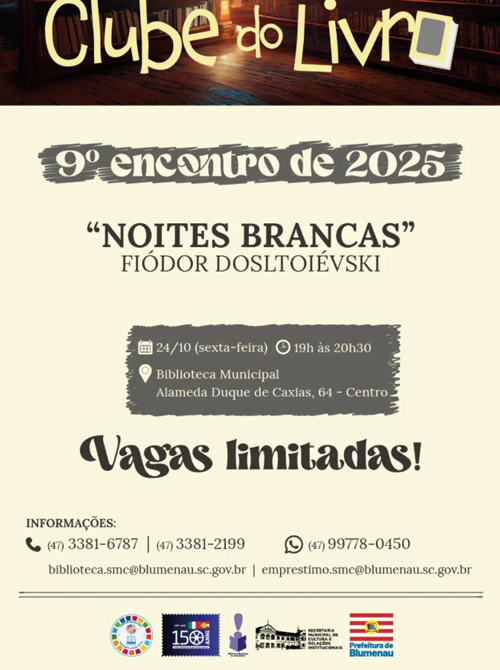 Os amantes da literatura russa e da prosa de Fiódor Dostoiévski têm um encontro marcado na Biblioteca Municipal Dr. Fritz Müller. O Clube do Livro se reunirá no dia 24 de outubro, às 19h, para mergulhar no universo lírico de “Noites Brancas”.