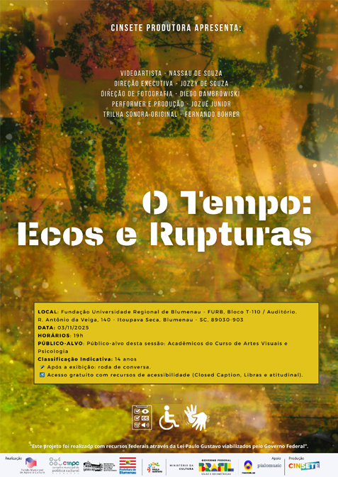 O cinema experimental será o destaque na Universidade Regional de Blumenau (FURB) com a exibição da videoarte “O Tempo: Ecos e Rupturas”, do artista Nassau de Souza. O evento, que é gratuito e aberto à comunidade, ocorrerá no dia 3 de novembro, às 19h, no Auditório do Bloco “T” da FURB. O evento contará com recursos de acessibilidade comunicacional, incluindo LIBRAS, audiodescrição (AD) e legendas descritivas.