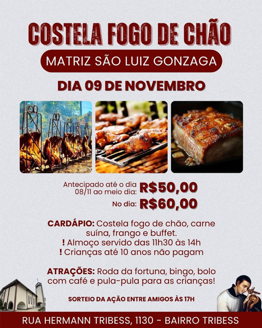 A Paróquia Matriz São Luiz Gonzaga se prepara para mais uma edição de sua tradicional Costela Fogo de Chão. O evento de confraternização acontecerá no domingo, 09 de novembro, com almoço sendo servido das 11h30 às 14h.