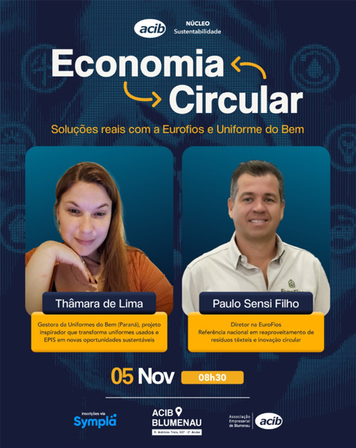 O evento, intitulado “Economia Circular: Soluções Reais com a EuroFios e Uniforme do Bem”, acontecerá no dia 05 de novembro, às 8h30, na sede da ACIB.