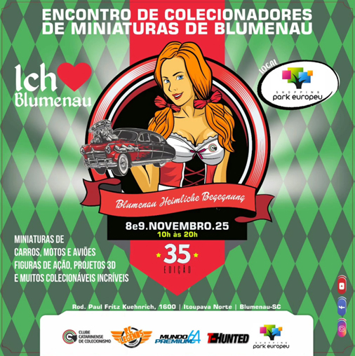 O Shopping Park Europeu será palco do 35º Encontro de Colecionadores Ich ❤️ Blumenau. O evento, que reúne colecionáveis e miniaturas incríveis, será realizado gratuitamente nos dias 8 e 9 de novembro de 2025.
