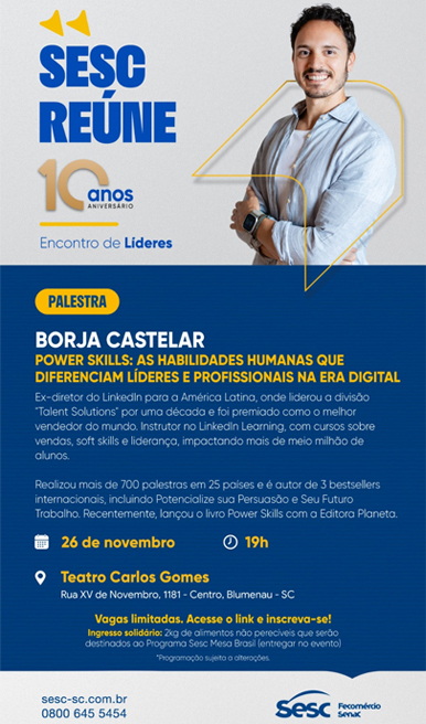 O Teatro Carlos Gomes receberá no dia 26 de novembro, às 19h, o palestrante internacional Borja Castelar para a palestra “Power Skills: As habilidades humanas que diferenciam líderes e profissionais na era digital”. O evento é voltado para empresários, líderes, gestores e profissionais de RH que buscam fortalecer suas habilidades na era digital.