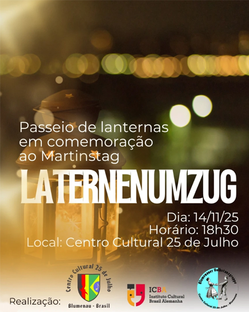 O ICBA (Instituto Cultural Brasil-Alemanha) Blumenau e o Centro Cultural 25 de Julho convidam a comunidade para a tradicional Caminhada de Lanternas, em celebração ao Martinstag (Dia de São Martinho). O evento será uma noite especial de luz, partilha e solidariedade, realizada no dia 14 de novembro, a partir das 18h30, na sede do Centro Cultural 25 de Julho.