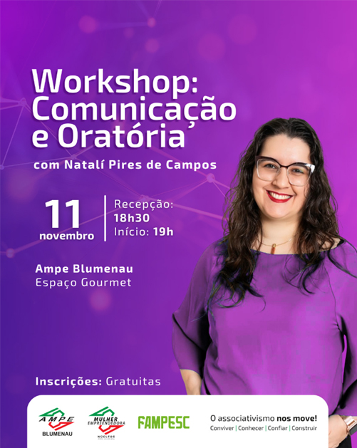 O workshop acontecerá no dia 11 de novembro de 2025. A recepção está marcada para as 18h30min, com início às 19h, na sede da AMPE Blumenau.