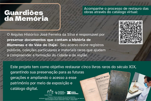 A ação de contrapartida social faz parte do Projeto Restauração de Livros Raros do Arquivo Histórico José Ferreira da Silva. Essa proposta cultural foi desenvolvida com recursos do Governo do Estado de Santa Catarina, pela Fundação Catarinense de Cultura (FCC), por meio do Prêmio Elisabete Anderle de Estímulo à Cultura – Edição 2024. A exposição permanece em cartaz por tempo indeterminado e pode ser visitada diariamente das 10h às 16h. A entrada é gratuita.