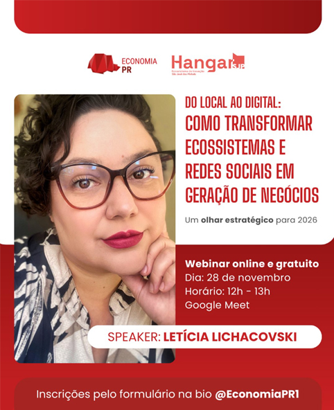 Em um cenário de constante transformação, o futuro da inovação e dos negócios exige um novo olhar estratégico. Pensando nisso, a Economia PR e o Hangar SJP promovem o webinar online e gratuito “Do Local ao Digital: como transformar ecossistemas e redes sociais em geração de negócios”.