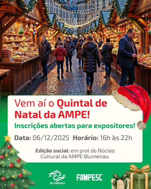 O clima natalino tomará conta da AMPE Blumenau com a realização do Quintal de Natal da AMPE, uma edição especial que visa encantar, conectar e celebrar o final do ano. O evento acontecerá no sábado, 06 de dezembro de 2025, das 16h às 22h, no estacionamento da sede da AMPE.