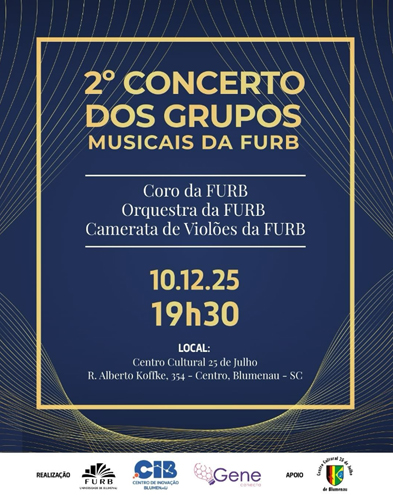 A FURB (Universidade Regional de Blumenau) realiza o 2º Concerto dos Grupos Musicais, que marca o encerramento do calendário anual de apresentações artísticas. O evento reunirá o Coro da FURB, a Camerata de Violões e a Orquestra da Universidade em uma celebração da produção artística universitária.