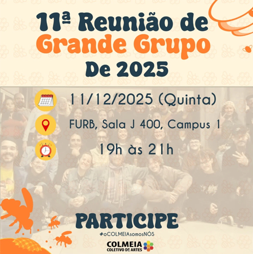 A reunião abordará a avaliação do Grande Evento – COLMEIA 2025 que ocorreu em agosto, permitindo que artistas e o público compartilhem suas impressões. Além disso, a reunião é uma chance para novos artistas se juntarem ao coletivo, entenderem as etapas de trabalho e se tornarem uma “abelha voluntária”.