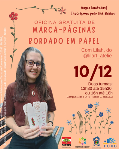 O Campus 1 da FURB receberá a Oficina Gratuita de Marca-Páginas Bordado em Papel, desenvolvida pela artesã Lilah, vinculada à Rede de Economia Solidária do Vale do Itajaí (RESVI). A oficina ensinará o passo a passo para a criação de um produto artesanal, pensado a partir dos princípios da economia solidária.