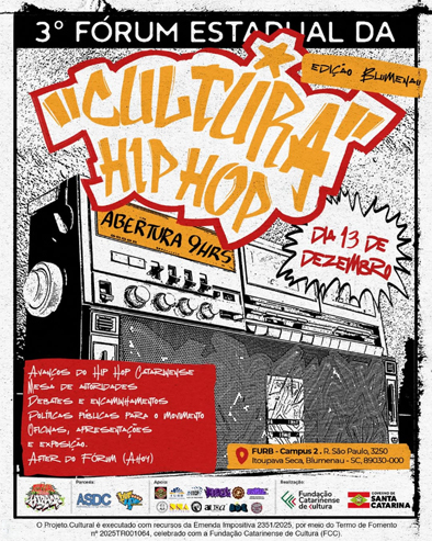 A FURB (Universidade Regional de Blumenau) sediará o 3º Fórum Catarinense de Hip Hop – Consciência, Cultura e Movimento neste sábado, 13 de dezembro. Em parceria com o Festival Catarinense de Hip Hop, N.A.R.U.A e Slam Descoloniza Blu, o evento busca fortalecer o movimento, dar voz às comunidades e construir coletivamente os rumos da cultura urbana em Santa Catarina.