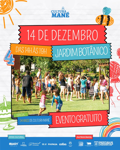 O projeto Cultura Mané comemora seu quarto aniversário com uma edição especial no local onde tudo começou: o Jardim Botânico de Florianópolis. O evento será neste domingo, 14 de dezembro de 2025, e promete uma tarde cheia de cultura, brincadeiras, saberes e muita alegria para toda a família.