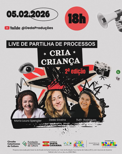 Após o sucesso da imersão criativa realizada no VEM Cultural, o projeto Cria Criança – 2ª edição promove, nesta quinta-feira (05/02), uma Live de Partilha de Processos. A transmissão acontece às 18h, pelo canal do YouTube @DedaProduções, e funciona como uma contrapartida social da iniciativa.