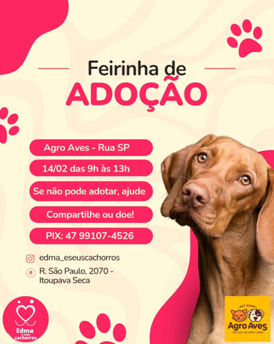 Com o objetivo de transformar vidas e encontrar novos lares para animais resgatados, acontece no dia 14 de fevereiro mais uma edição da Feirinha de Adoção. O evento será realizado na Agro Aves, localizada na Rua São Paulo, nº 2070, no bairro Itoupava Seca, das 9h às 13h.