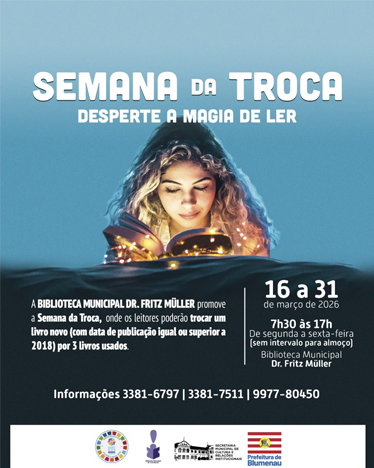A Biblioteca Municipal Dr. Fritz Müller promove entre os dias 16 e 31 de março mais uma edição da “Semana da Troca”, uma iniciativa que busca ampliar o acervo e fomentar a leitura em Blumenau. A expectativa é arrecadar cerca de 400 novos livros para empréstimo ou leitura no local. Interessados em participar podem obter maiores informações pelos telefones 3381-7511 e 3382-6787 ou no WhatsApp 99778-0450.