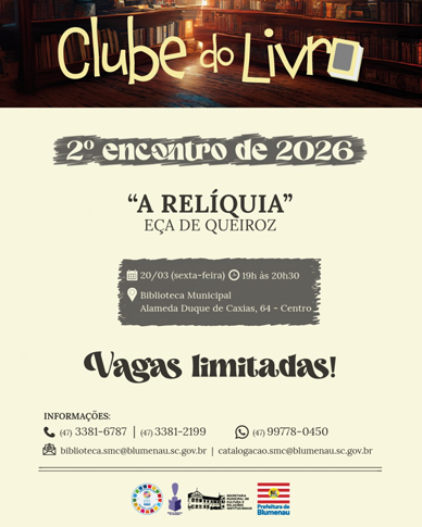 A Biblioteca Municipal Dr. Fritz Müller promove nesta sexta-feira, dia 20, às 19h, o segundo encontro do ano do Clube do Livro. Para a atividade, a mediadora do programa Mariana Vidal selecionou a obra “A Relíquia”, de Eça de Queiroz. Mais informações podem ser obtidas pelos telefones 3381-2199, 3381-7511 e 3381-6787, pelo WhatsApp 9 9778-0450 ou e-mail: [email protected]. As vagas são limitadas.
