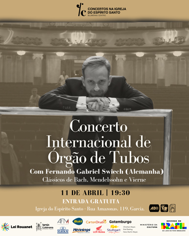 Fernando Gabriel Swiech é um músico de destaque internacional, radicado na Alemanha. Sua vinda a Blumenau representa uma oportunidade rara para o público local prestigiar a técnica refinada exigida pelo órgão de tubos, instrumento que é o coração das grandes tradições luteranas.