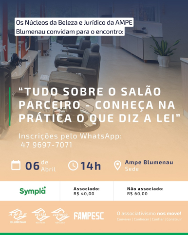 No dia 06 de abril, a AMPE Blumenau realiza um evento fundamental para quem empreende no setor de estética e bem-estar. Através de uma iniciativa conjunta dos seus Núcleos da Beleza e Jurídico, a entidade promove um workshop focado na Lei do Salão Parceiro, abordando como essa legislação pode ser a chave para a segurança jurídica e o crescimento sustentável de negócios do setor.
