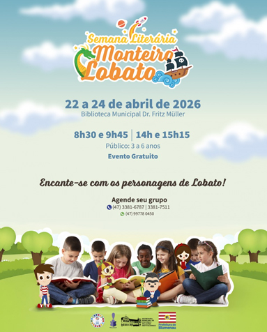 A Biblioteca Municipal Dr. Fritz Müller abriu o período de agendamento para escolas interessadas em participar das atividades da Semana Literária Monteiro Lobato, que ocorre entre 22 e 24 de abril em quatro horários diários: 8h30, 9h45, 14h e 15h15. A programação é voltada para crianças entre 3 e 6 anos e contará com a participação dos personagens do Sítio do Picapau Amarelo, obra do escritor homenageado. Interessados podem entrar em contato pelos telefones 3381-7511 e 3381-6787 ou pelo WhatsApp (47) 9977-80450. As vagas são limitadas.