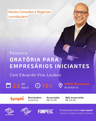 Falar em público e vender uma ideia com clareza ainda são barreiras para muitos empreendedores que estão começando. Pensando nisso, o Núcleo Conexões e Negócios da AMPE Blumenau promove, no próximo dia 28 de abril, às 19h, o evento “Oratória para Empresários Iniciantes”. O encontro será realizado no Auditório da AMPE e promete ser o ponto de virada para quem busca confiança e posicionamento no mercado.