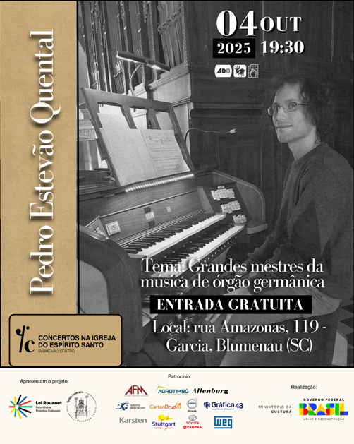 A Série de Grandes Concertos da Igreja do Espírito Santo traz a Blumenau uma noite de destaque para a música sacra. No próximo dia 4 de outubro (sábado), às 19h30, a Comunidade Luterana do Espírito Santo (Rua Amazonas, 119) recebe o organista Pedro Estevão Quental (SP) para um recital gratuito. O concerto será focado no […]